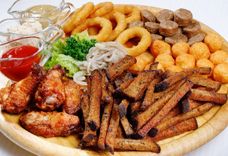 1260 г • Шарики сырные, колбаски «По-домашнему» жареные, крылышки к пиву, гренки острые, кольца луковые фри, картофель фри, кульки "огонек",лук маринованный, горчица, хрен, кетчуп, салат