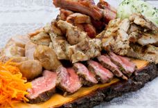 810 г • Мясная закуска на гриле из вырезки говяжей, ребрышек копченых, домашней колбаски, бедрышек куриных, пряной моркови, маринованного лука, зелень